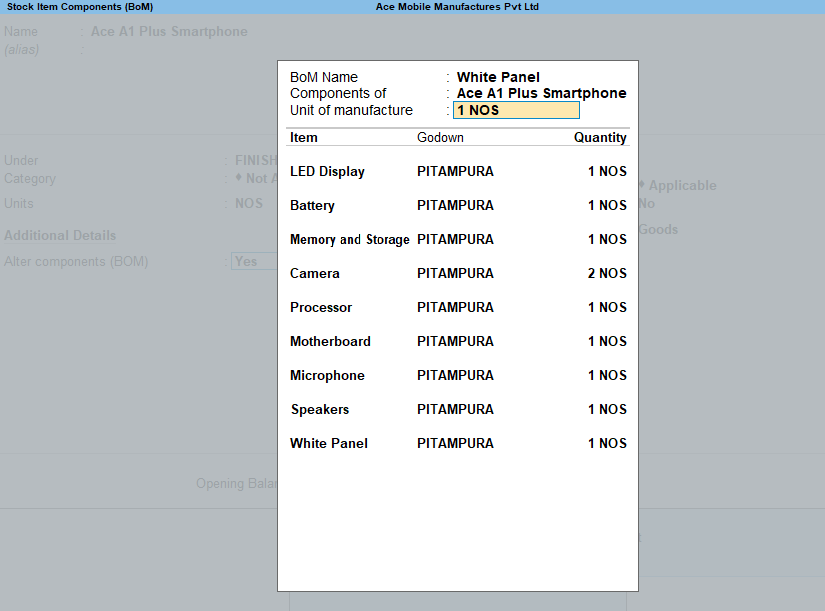 In this case, a single finished product ‘Ace A1 Plus Smartphone’, we have 3 different bill of material, namely Blue panel, White Panel and Black panel as shown below.