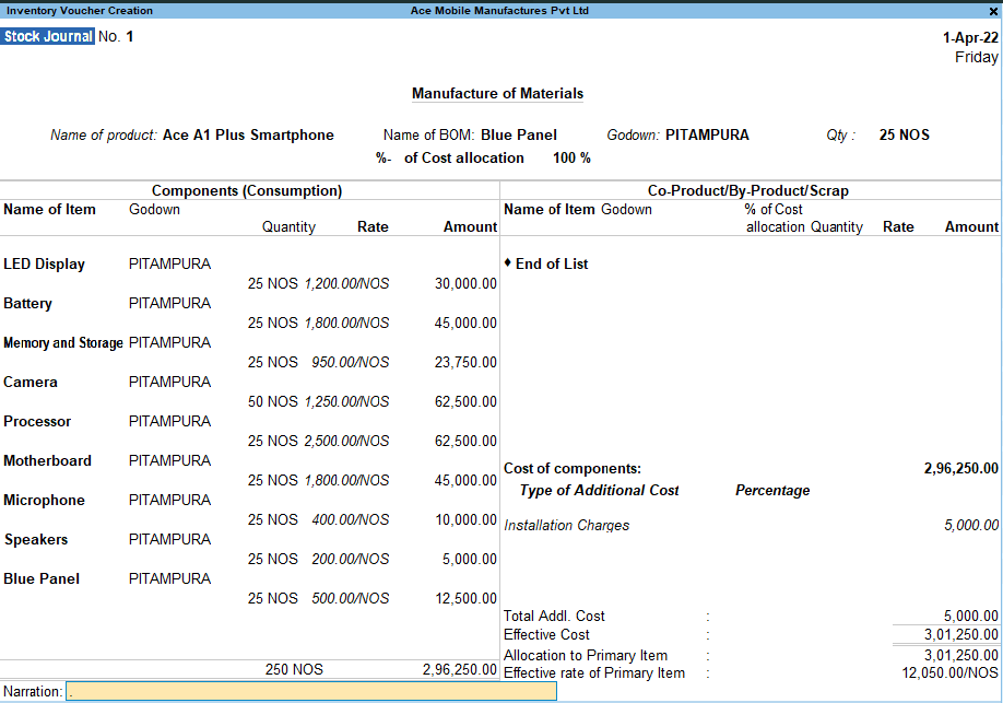 Step No 1 : Firstly Ace Mobile Manufactures Pvt Ltd Purchase the above Components from Narang Telecom to create (finished product) FOR 100 Nos on 1 April (Bill no- PUR/215) stored at Pitampura godown